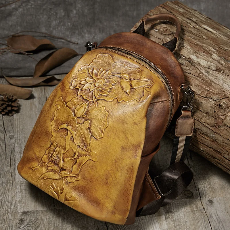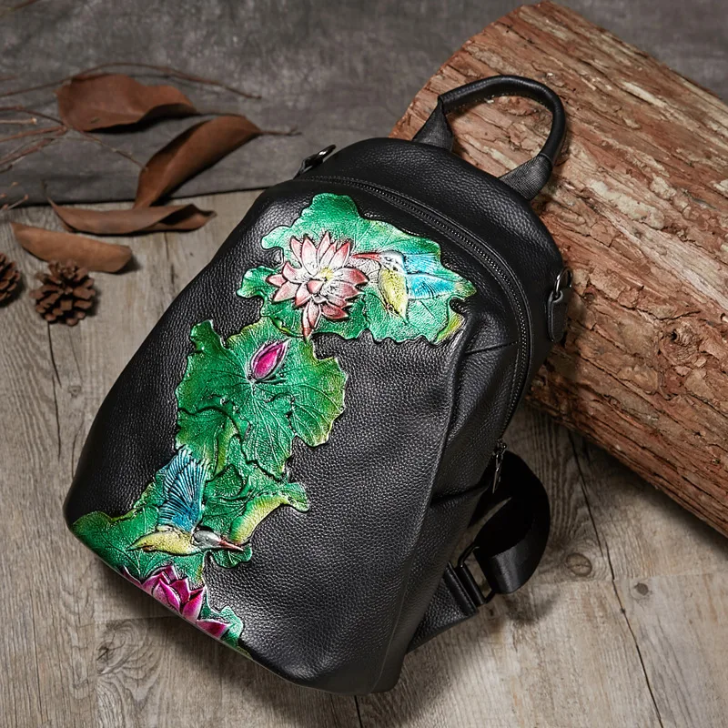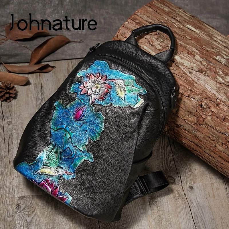 Promo Johnature High Quality Genuine Leather Women Backpack 2019 New Retro Handmade Embossing Cowhide Lei